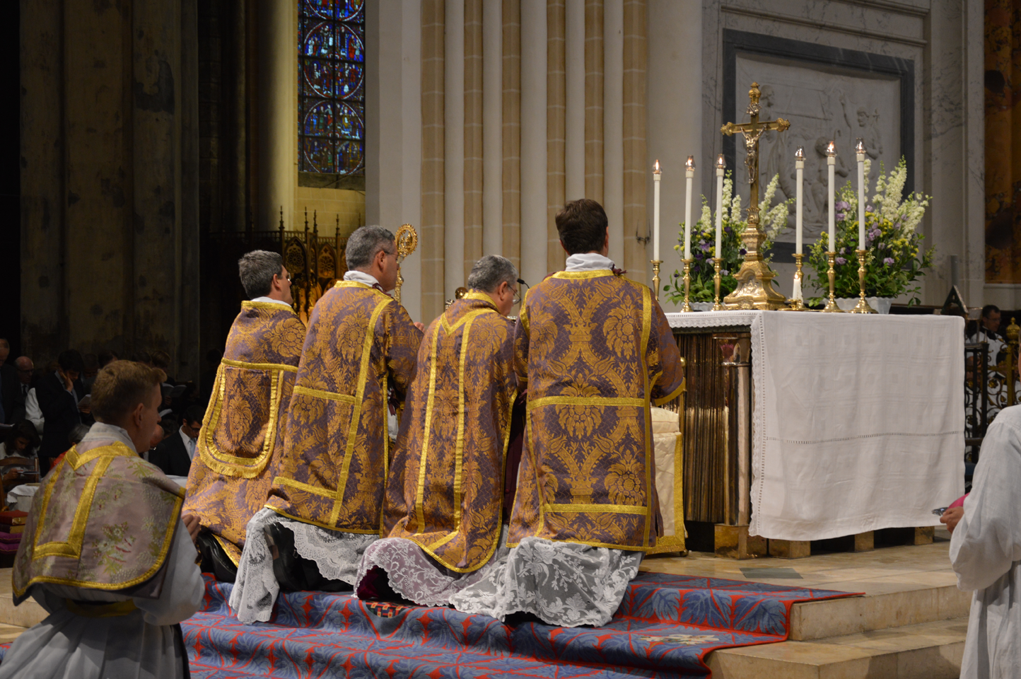 Actually I think the (presumably 17th century) high altar is a monstrosity which does not accord with its setting. But it is at least in the right place, whereas the forward modern cube is not. The same can be said for ND de Paris, Rheims and other places; good historical, liturgical and architectural sensibility might have replaced these with something more in keeping with a medieval building (although the sculpture could be displayed to effect elsewhere).